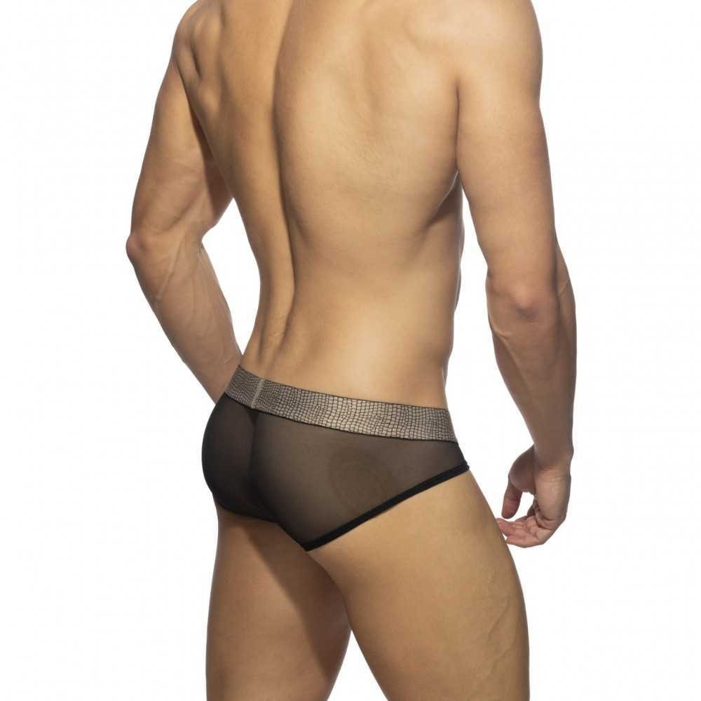 Μαύρο διχτυωτό σλιπ από λεπτότατο ύφασμα Σύνθεση: 93% πολυεστέρας - 7lastane Τυπωμένη ζώνη μέσης με λογότυπο από σιλικόνη φιδάκι με χρυσό εφέAD στη μέση της ζώνης C-through ελαστικό ύφασμα πολύ άνετο Σχεδιασμένο και κατασκευασμένο στη Βαρκελώνη