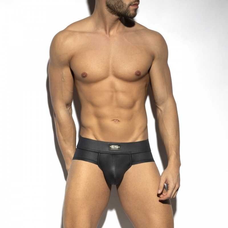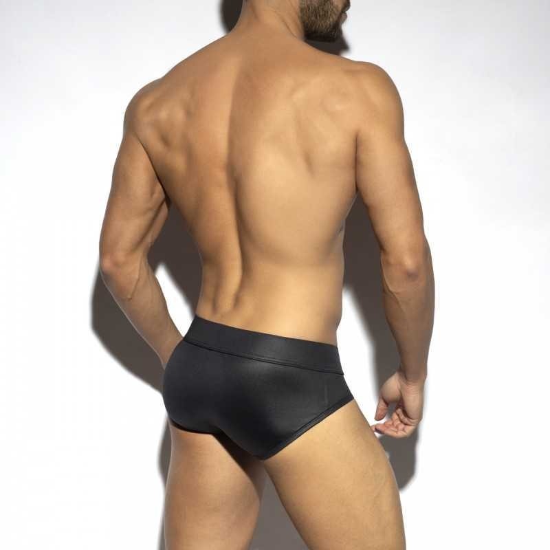 Γυαλιστερό σλιπ από πλαστικοποιημένο ύφασμα ECOWAVEΚατασκευάζεται από 85COYARD πολυαμίδιο και 15lastaneΟικολογική κλωστή από ανακυκλωμένα μπουκάλια από τη Μεσόγειο ΘάλασσαES Collection ετικέτα σιλικόνης στη ζώνη της μέσηςΤο τέλειο ρούχο για μια ιδιαίτερη περίστασηΣχεδιασμένο και κατασκευασμένο στη Βαρκελώνη