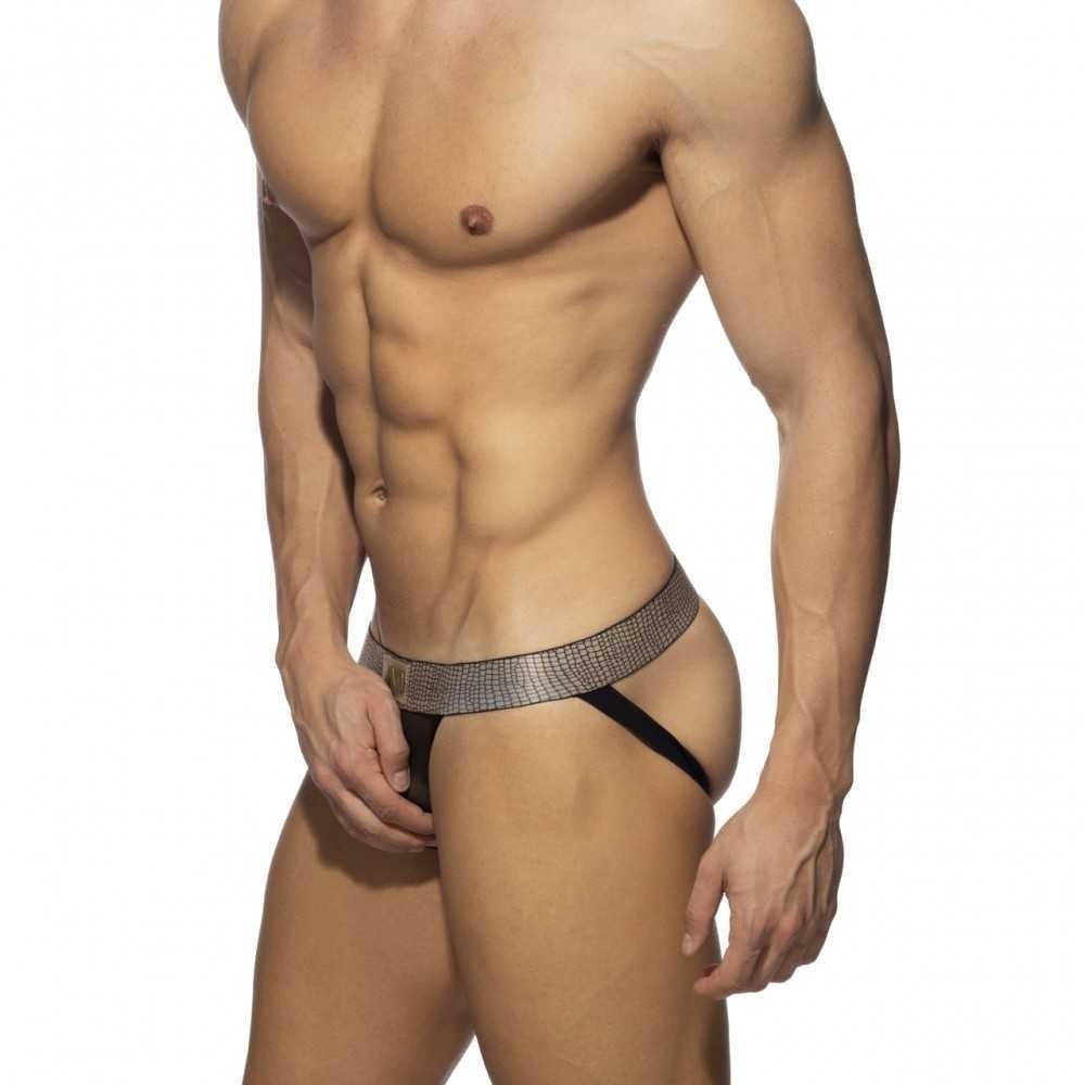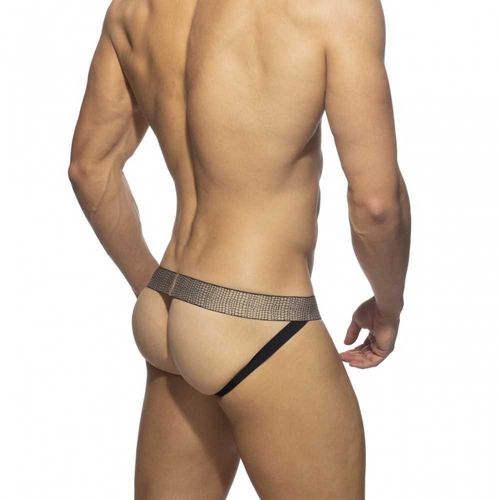 Black net jockstrap made of finest fabric Composition: 93% Polyester - 7% Elastane Printed waistband with a snake golden effect AD silicon logo in gold in the middle of the waistband C-through stretchy fabric very comfortable Black elastic bands on the back lift your cute ass Proudly designed and made in Barcelona