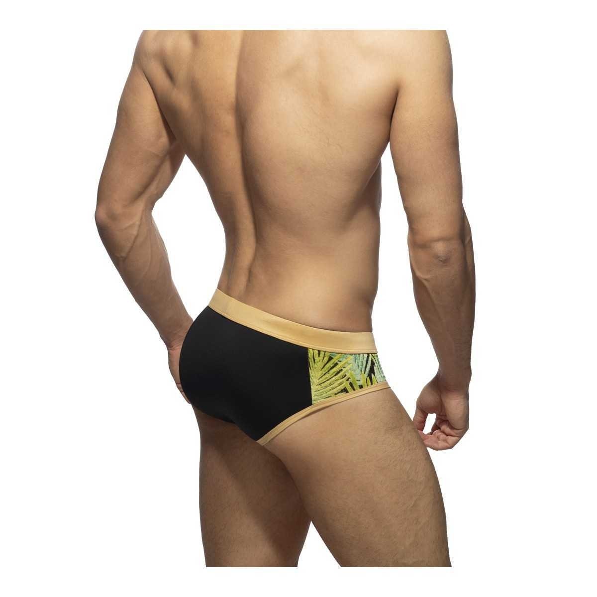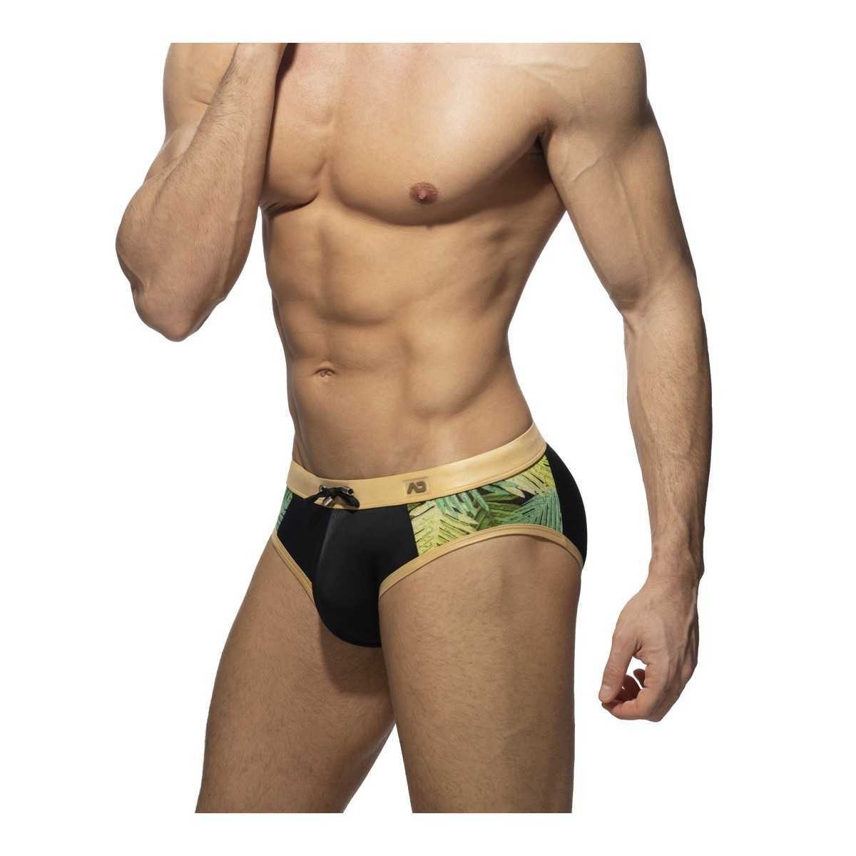 Amazonian style - with a little J.Lo on the side. Be as iconic as J.Lo was during the 2000 Grammy Awards as you strut your stuff on the beach. With the dual jungle-themed leaves pattern on each side, smooth ultra-sexy lines, and modern black colour-blocking - these Swim Briefs simply excude exclusive tropical style. Svelte. Sleek. Sexy. You´ll be more than just Jenny from the block... you´ll be Pablo from the Penthouse. Contrasting waistband and hem-detailing in luxurious matte gold colour. Comes with stealth PackUp Technology built into front pouch area (removable). Front drawstring bands in matching black colour with metal restrainers on each end. AD Silicone logo on front left side. 90% Polyester - 5% Elastane - 5% Lurex Proudly Designed & Made in Barcelona
