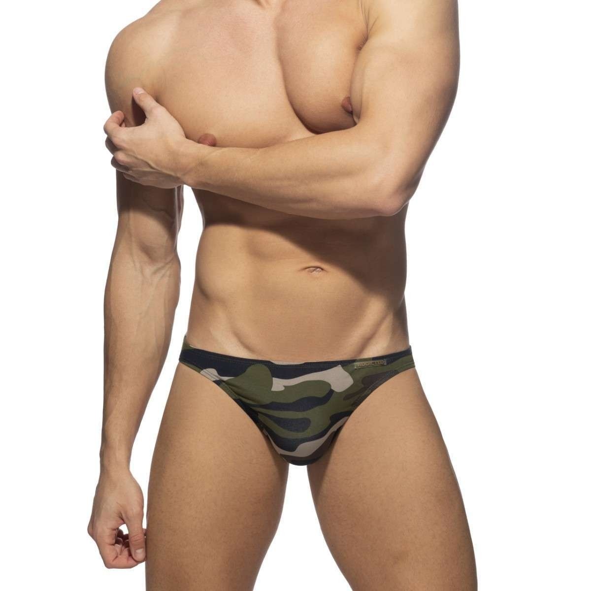 Σλιπ μπικίνι με καμουφλάζ από λεπτό βαμβάκι (95%) και ελαστάν (5%). Εκτύπωση καμουφλάζ παντού σε πράσινο, μπεζ, μαύρο και καφέ χρώμα. Τεχνολογία MOLDED στη θήκη. Η μορφοποίηση της θήκης αποφεύγει τις περιττές ραφές και δημιουργεί επιπλέον όγκο. Ετικέτα σιλικόνης ADDICTED στην αριστερή πλευρά της μέσης